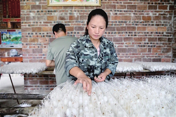 绝境中,是各族乡亲的援手焐热了她的心。相邻的壮族阿婆送来了新鲜蔬菜、一位大叔把存折塞到她手里说“先花着、不急还”,瑶族同胞主动帮她修补鸡舍……这份左邻右舍的情谊,成了秦远莲咬牙坚持的底气。她白天种桑养蚕,晚上学习养殖技术,还兼任龙利村扶贫信息员的工作。没有种养技术经验,那就从头学起,当扶贫贴息贷款一发放,她便做好了扩大五黑鸡和黑山羊养殖规模的准备。当第一批禽畜顺利出栏,此起彼伏的鸣叫,在她听来,恰似生命绽放的欢歌。债一点点还清了,村民们对她的信任也一点点积累起来。