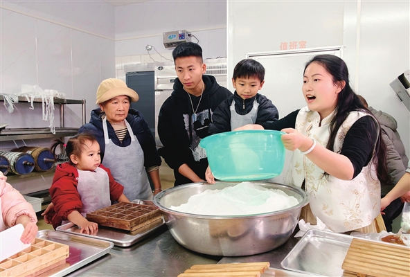 12月21日冬至,在融安县大将镇雅仕村,清蒸米糕制作技艺非遗传承人王新月现场授课,带领孩子们动手学习米糕制作,在实践中感受非遗传统文化的魅力,助力传统文化代代相传。图为王新月(右一)在传授米糕制作技艺。