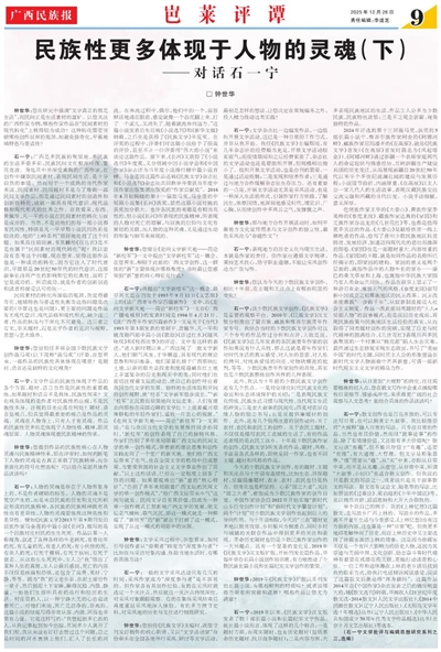 石一宁:我提出“文学新桂军”这一概念,最早其实是在刊发于1993年9月11日《文艺报》上的《读广西青年作家四篇新作》一文中,而《走向文学新天地——简论“新桂军”》一文在《广西广播电视报》的发表时间是1994年4月21日。《读广西青年作家四篇新作》一文是关于《当代》1993年第3期发表的常弼宇、黄佩华、凡一平和姚茂勤四部中篇小说《歌劫》《涉过红水》《随风咏叹》和《桂西往事》的评论。文中有这样的表述:“进入新时期以来,广西出现了一批文学新人,他们朝气风发,才华横溢,具有现代的理论思维和知识准备。他们紧紧扎根于广西那块红土地,以新的眼光去探索和发现蕴藏在红土地上丰富复杂的历史和现实中的美;同时他们也密切注视着文坛的动态,使自己的创作呼应着我国当代文学的发展。独特的生活体验和开阔的创作视野,使‘桂系’文学新军稳步成长。”“新‘桂军’正沉着而顽强地向文坛走来。人们有理由向那些在南国边陲的文学红土上披星戴月艰难耕耘的年轻作家们,遥致一片衷心的祝愿。”《走向文学新天地——简论“新桂军”》一文则说:“在与我国当代文学的发展保持同步的同时,‘新桂军’的创作表现了自己的独特风格。作家们告别了多年来局限着广西文坛的民间文学的单一创作模式,带着新的理论思维和创作实践走向了一个宽广的新天地。他们给广西文坛带来了生气,也在全国文学的格局中自成景观,为繁荣我国的社会主义文学事业作出了贡献。”以上这些话语,已经在一定程度上回答了你的问题。如果要提炼出“新”意的“核心特征”,“告别了多年来局限着广西文坛的民间文学的单一创作模式”,“给广西文坛带来生气”这两句就是。民间文学自有其价值,但成为一种单一创作模式长期影响广西文学的发展,使文坛老气横秋、暮气沉沉,那这一模式就是一种弊端了。“新桂军”的“新”就在于打破了这一模式,实现了从这一模式的局限中的突围。