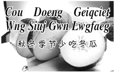 Linghvaih, aenvih lwgfaeg singq caep, boux bingzseiz miz aendungx heiq nyieg、dungx caep insep aeu siuj gwn, boux baenz bingh nanz caeuq boux gen’ga gyoetgyat yiengz haw geih gwn.