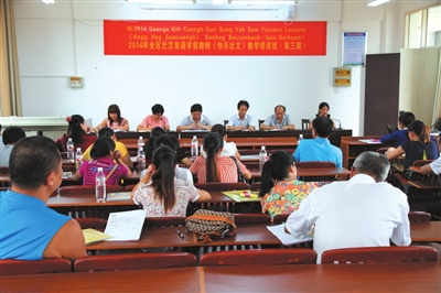 9 nyied 19 hauh daengz 20 hauh, 2014 nienz daengx gih Cuengh Gun song vah saw yozcenz lauxsae “angq hag Sawcuengh” sonhag geiz daihsam beizyinbanh youq Vanzgyangh Mauznanzcuz Swciyen Swh’wnh Cin Yinzhoz Siujyoz banh ban. Hozciz Si 19 aen Cuengh Gun song vah saw sawqniemh siujyoz gungh miz 30 boux lauxsae daeuj camgya beizyin hagsib. Gyoengq boux lauxhangz Sawcuengh Gvangjsih Minzcuz Gyauyuz Fazcanj Cunghsinh、Gvangjsih Sawcuengh Yozyau haenx daeuj daengz yienhciengz sonyinx beizyin. Beizyin ngoenzde, Yinzhoz Siujyoz Loz Sauveiz、Cinz Yivangj song boux lauxsae hawj gyoengq lwgnyez yozcenzbanh son Sawcuengh, doenggvaq dohmeizdij canjsi、guhcaemz mizyinx、 gyoeb cihsaw yawj doz、boihdoeg cihmoq daengj lai cungj fuengsik gyoengq lwgnyez haengj guh maij hag neix, hawj gyoengq lwgnyez youq gij gifwn angqyangz ndawde hag doeg singmeh “f、 v、 d 、nd 、n”. Youq gwnz aen dangz sonhag vaiqvued neix, sawj gyoengq lauxsae daeuj beizyin neix dingq ndaej haeujsim lili, bouxboux cungj haenh naeuz gij goq neix ndei raixraix. Baez beizyin neix, cawz le riengzban dingq go le, lij guh baen cuj yenzgiu daujlun、lauxhangz diemj- bingz、conhdiz gyangjco daengj fuengsik lingzvued lai yiengh neix, roengzrengz hawj gyoengq boux yozyenz hag ndaej gij cihsiz haenx rox yungh daengz giz saedsaeh bae.