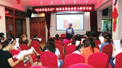 Duh’anh Aen Sanghvei Mehmbwk Banh Ban Son’gyauq Fwen Banggungz 都安妇女商会举办扶贫山歌培训班 Ndwen 8 ngoenz 18, Duh’anh Yauzcuz Swciyen Aen Sanghvei Mehmbwk youq Ginhfuzgwz banh aen ban son’gyauq fwen banggungz “swnjcienz vwnzva feihyiz”, 50 boux bouxhag mehmbwk caeuq- faenh aen hozdung son’gyauq mbouj aeu cienz. Doenggvaq haiguh son’gyauq hagsib hozdung, mbouj- duenh swnjcienz vwnzva fwen, coicaenh aen doih fei |