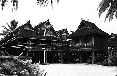 西双版纳傣族居住的传统干栏式建筑一般是竹木结构的两层楼房,柱、梁是木质的,围墙用竹片编织,剖开的竹子压平做楼板,门、窗也用竹子制作,屋顶盖以草编织的“草排”或小平瓦盖成,楼呈方形,上下两层,上层住人,距地约2.5米,下层无墙,高脚柱裸露,用以饲养牲畜、家禽,堆放农具、木柴等杂物。拾级登楼,外有走廊、晒台,可晒物和纳凉。晒台内侧一角,搭一小台,草排盖顶,置土锅盛凉水;晒台一角,搭一长台用竹笆垫底,竹筒框边,内盛沃土,种植各类葱、姜、芫荽等佐料。内为居室,隔成两半,一半为卧室,一半为客厅加“厨房”,灶具为用三脚架的火塘,既可做饭,又可取暖、照明。竹楼具有通风好、凉爽、避潮湿、防野兽、防白蚁、抗洪灾等很多的优点,特别适用于西双版纳地区。