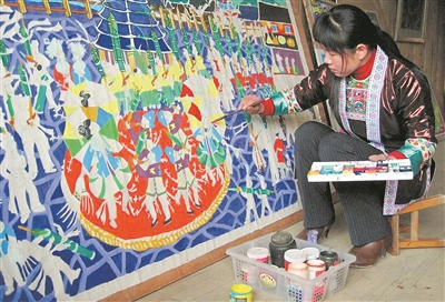 Mbawveh vunzguhnaz Sanhgyangh, dieggoek swnjcienz dajveh cawjdaeuz comz youq Sanhgyangh Duzdung Cin, ranghdieg swnjcienz nangq daengz Dungzloz、Bazgyangh、Gujyiz、Doujgyangh、Liengz- gouj、Meizlinz daengj yanghcin. Gij veh neix lizsij gyaenanz, seiz Dangzciuz couh caep maenh giekdaej, Cingciuz “Vehbaengzdung” ranghdieg Bouxdung Sanhgyangh gaenq riuzmingz gwnzbiengz. Mbawveh vunzguhnaz Sanhgyangh youq dangdieg aeu caizliuh, gaxgonq dwg aeu mijrek、 goromj caiqlij gij lwgmak gwnz bya guh liuhsaek, aeu nyefaex guh bitveh, gvaqlaeng liuhsaek swnggaep baenz mbaraemx、bingjhih daengj. Mbawveh mboujdan veh youq gwnz ceij、ciengz、baengz, lij veh nyumx hwnj gwnz ndangdaenj、daehbeq、saihwet、daehngaenz、gaenfwngz Bouxdung daengj doenghyiengh ngoenznaengz yungh haenx bae. Aeu laeuzgyong guh gyangsim, bau daengz giuzbumz、laeuzheiq、ranzcanx daengj vwnzva yienhsiengq aenranz、minzsug fungcingz、sibgvenq gvaq ndwenngoenz daengj, cungj dwg daezcaiz youqgaenq mbawveh vunzguhnaz Sanhgyangh dajveh haenx, hawj gij hingzsik caeuq neiyungz de ndaej giethab caeuq doengjit ndaej engq ndei, gyoebbaenz gij minzcuz funggek daegbied gag miz ndeu. Mbawveh vunzguhnaz Sanhgyangh gij saek de doiq- beij haenqhwd, gij heiq gvaq ndwen- ngoenz naekgywg, daezcaiz genjleh gagdingh, gyoepdoz simlangh, giuj yungh aenfap sanqdiemj daeuqrongh. Aeu coenz vah ndeu daeuj gangj de dwg: Riengz sim siengj bae genjleh daezcaiz, “hozoiq simlangh” dwk bae cawqleix najveh, “fouz dauhleix” dwk bae gyoep gij saek, cienz fuengvih lai gakdoh bae yienj diemjyawj. Lumjbaenz mbawveh《Gangjguenj》, couh lumjlili dwk yienh’ok le gij cingzgingj vunzlai ndaw mbanj comz youq diegdangz naj laeuzgyong dingq goengguenj gangj- guenj haenx.