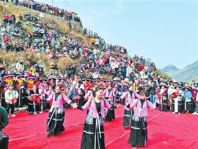 本报讯(记者 陆照德) 1月30日,隆林苗族跳坡节在德峨镇老坡场开坡,数万各族同胞欢聚坡场,在动人的苗族芦笙声中,手牵手载歌载舞,见证身手矫健的苗族男子爬坡杆饮酒摘腊肉头朝下顺溜而下的精彩画面,见证着各民族女子节日盛装的绚丽多彩与华美,见证着一幅乡村文化振兴、民族“三交”日益深入的民族团结进步画卷。