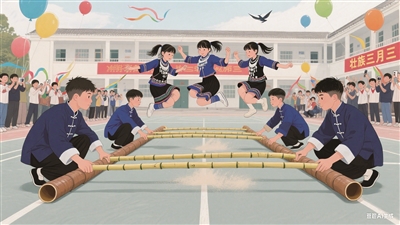 “三月三”这天,我们学校开展了许多庆祝活动,有唱山歌、抛绣球、三人板鞋竞速、跳竹竿……项目丰富,不胜枚举。当天,大家一大早就来到学校,操场上早已人山人海,人声鼎沸。同学们穿着各色壮族服装,宛如彩蝶在操场上飞舞,场面热闹非凡。