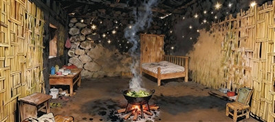 第一次去阿龚家,他们一家人住的还是石头房子。多年的风雨侵蚀,石头房子已经很旧很黑了,是那种长期被烟熏的黑。房子简陋,正面与侧面是细竹扎成的墙体,背面则是用石块垒起来的,到处透光,斑驳的光像满天星星一样镶嵌在墙体上。如果起风,风会从那些缝隙里灌进来,有时还能听到呜呜的风声。屋子里用木板隔起两间卧室,家里没有几件家具,但随意摆放的物件让整个空间显得十分凌乱。夯实的泥巴地板,被一家人踩出黑亮的光泽,与横梁上的黑烟互相呼应,火塘三脚架上的铁锅里,漂浮着缺少油星的青菜。